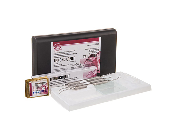 При смешивании порошка материала «Триоксидент» с дистиллированной водой при температуре 18-23оС и влажности 50±10% в весовом соотношении 3:1 образуется удобная в применении паста, не теряющая пластичность в течение 10-15 минут. Материал твердеет в полости зуба в течение 4-х часов, полное отверждение происходит за 24 часа.