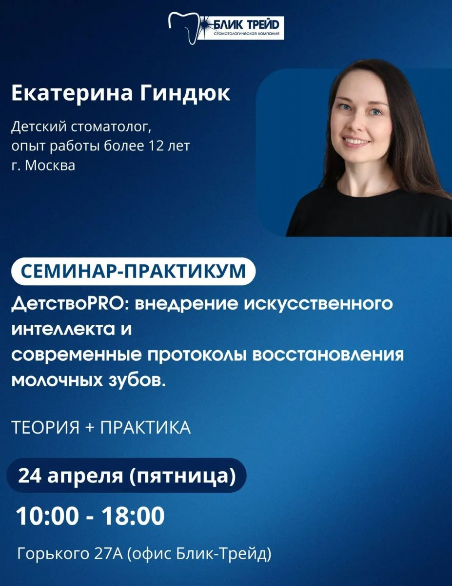 ДетствоPRO: Внедрение искусственного интеллекта и современные протоколы реставрации молочных зубов – семинар Екатерины Гиндюк! Уважаемые коллеги! Приглашаем вас на уникальный семинар-практикум от ведущего детского стоматолога из Москвы, Екатерины Гиндюк. Это событие для тех, кто стремится к совершенству в работе с маленькими пациентами. Спикер: Екатерина Гиндюк (г. Москва) — детский стоматолог с опытом работы более 12 лет, эксперт в области современных методик и технологий. На семинаре вы узнаете и отработаете: